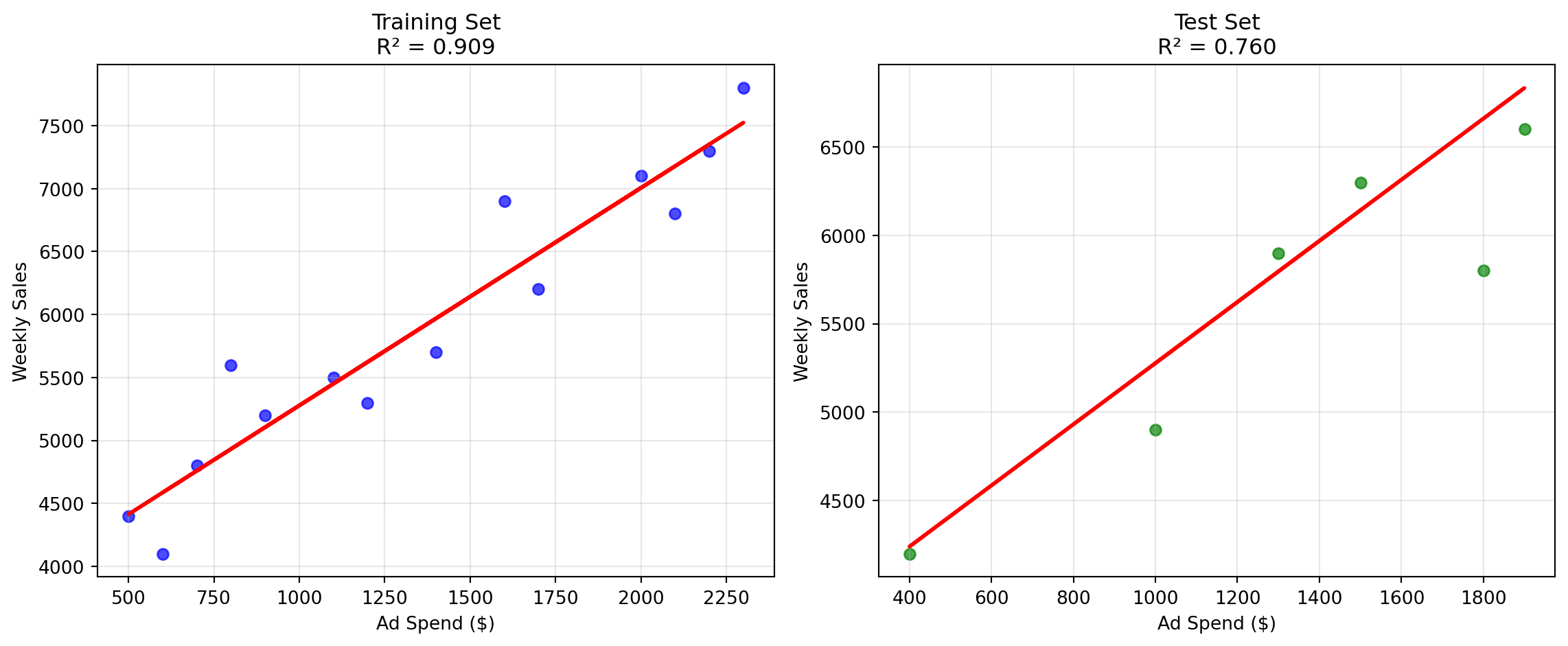 # Calculate R² step by stepy_mean = np.mean(y)tss = np.sum((y - y_mean) **2) # Total Sum of Squaressse = np.sum((y - predictions) **2) # Sum of Squared Errorsr_squared_manual =1- (sse / tss)# Compare with sklearn's calculationr_squared_sklearn = r2_score(y, predictions)print(f"Manual R² calculation: {r_squared_manual:.4f}")print(f"Sklearn R² calculation: {r_squared_sklearn:.4f}")print(f"Model R² (from .score() method): {model.score(X, y):.4f}")print(f"\nInterpretation: {r_squared_manual:.1%} of the variation in weekly sales")print(f"is explained by advertising spend in our model.")