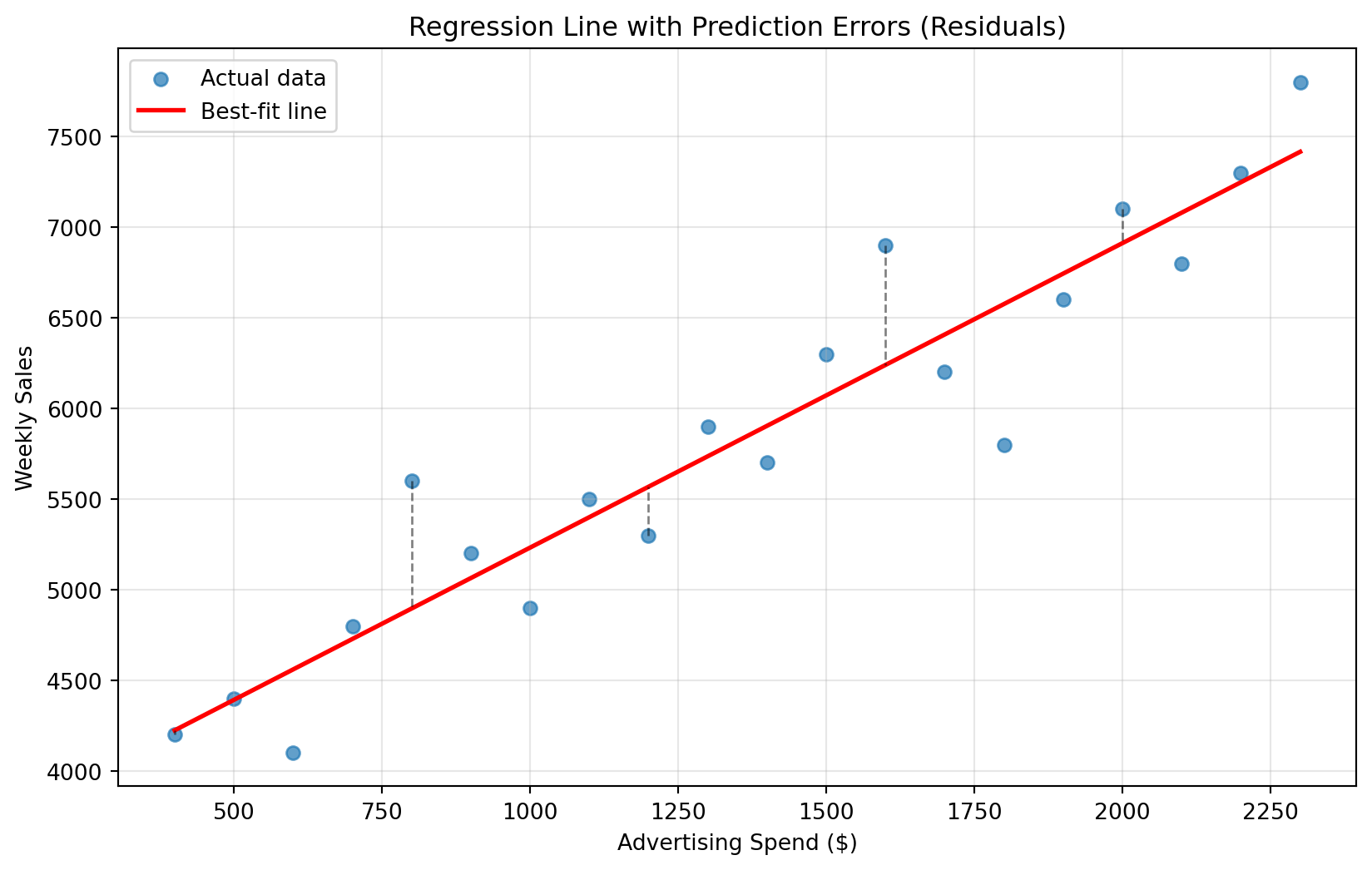 import pandas as pdimport matplotlib.pyplot as pltimport numpy as npfrom sklearn.linear_model import LinearRegressionfrom sklearn.metrics import mean_squared_error, mean_absolute_error, r2_score, root_mean_squared_error# Recreate our advertising datadata = pd.DataFrame({"ad_spend": [400, 500, 600, 700, 800, 900, 1000, 1100, 1200, 1300, 1400, 1500, 1600, 1700, 1800, 1900, 2000, 2100, 2200, 2300],"weekly_sales": [4200, 4400, 4100, 4800, 5600, 5200, 4900, 5500, 5300, 5900, 5700, 6300, 6900, 6200, 5800, 6600, 7100, 6800, 7300, 7800]})# Fit our regression modelX = data[['ad_spend']]y = data['weekly_sales']model = LinearRegression()model.fit(X, y)# Make predictionspredictions = model.predict(X)# Visualize the fitplt.figure(figsize=(10, 6))plt.scatter(data['ad_spend'], data['weekly_sales'], alpha=0.7, label='Actual data')plt.plot(data['ad_spend'], predictions, color='red', linewidth=2, label='Best-fit line')# Show residuals for a few pointsfor i inrange(0, len(data), 4): # Show every 4th point to avoid clutter plt.plot([data['ad_spend'].iloc[i], data['ad_spend'].iloc[i]], [data['weekly_sales'].iloc[i], predictions[i]], 'k--', alpha=0.5, linewidth=1)plt.xlabel('Advertising Spend ($)')plt.ylabel('Weekly Sales')plt.title('Regression Line with Prediction Errors (Residuals)')plt.legend()plt.grid(True, alpha=0.3)plt.show()