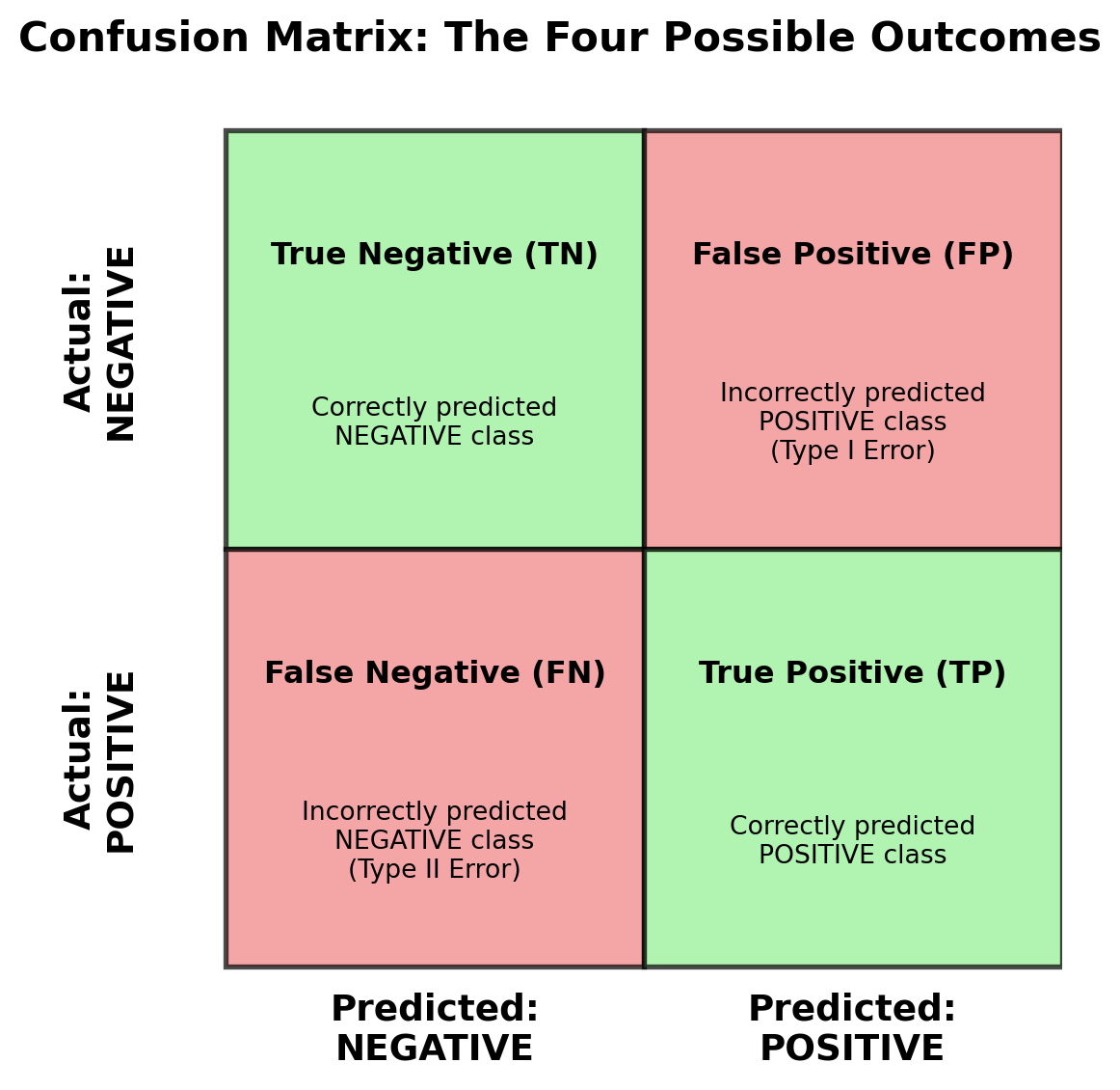 Before diving into real examples, let’s understand the conceptual framework of a confusion matrix. Think of it as a 2×2 table that organizes all possible prediction outcomes: