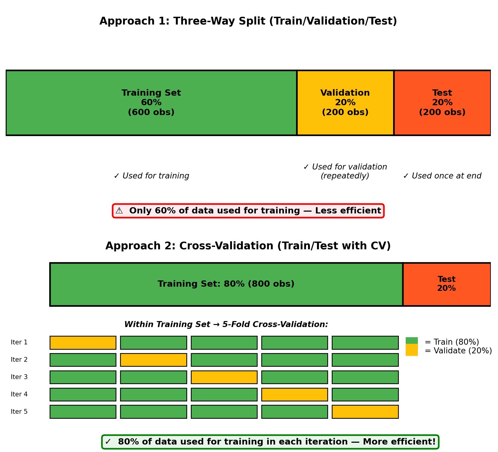 Before we get to cross-validation, let’s understand the ideal (but not always practical) solution: splitting your data into three parts instead of two.