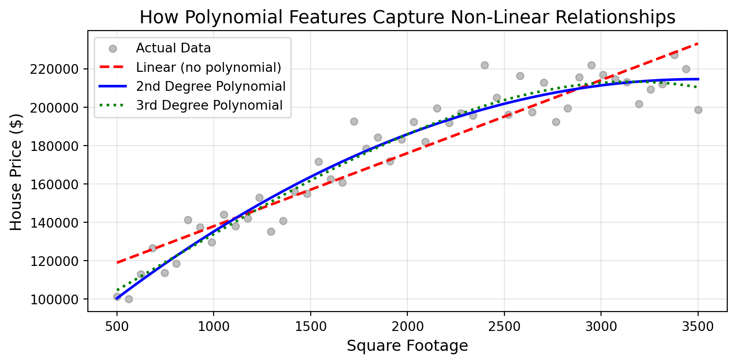 Consider this scenario: You’re building a model to predict house prices using just two features—square footage and year built. Your model achieves an RMSE of 20,247. Not bad, but could be better. Now, what if you created a new feature: house age (calculated as current year minus year built)? Suddenly, your RMSE drops to 17,138. By creating just one thoughtful feature, you’ve significantly improved your model’s performance.