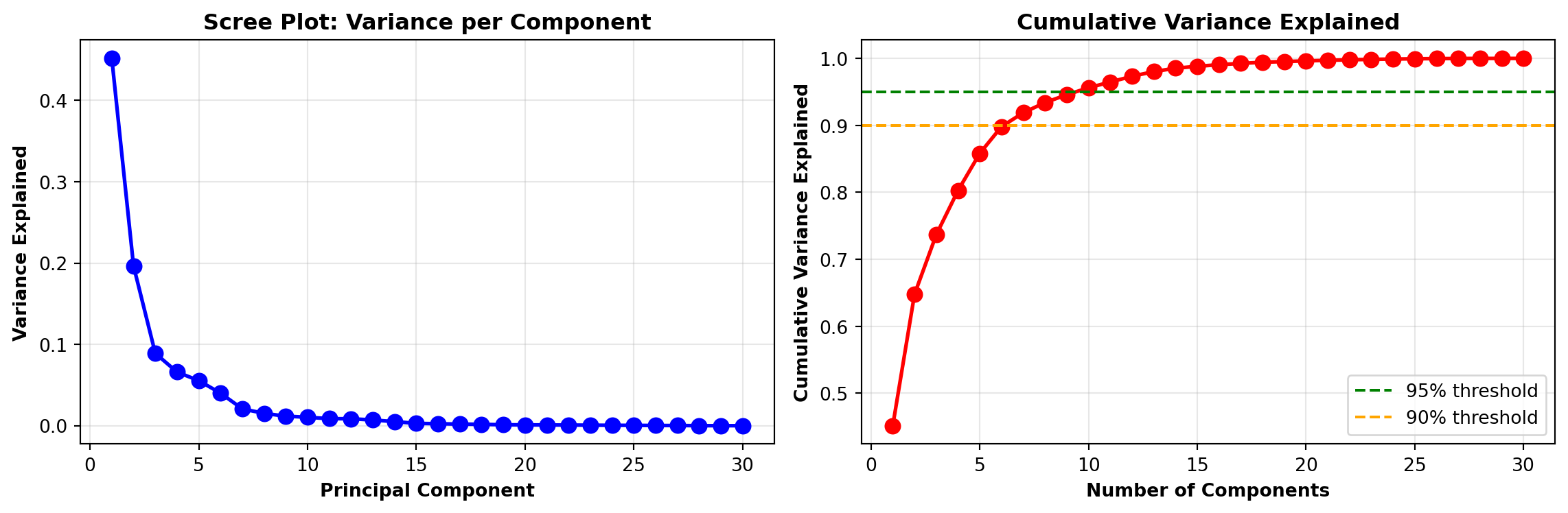 print(f"Accuracy difference: {abs(acc_original - acc_pca):.3f}")Accuracy with 30 original features: 0.988